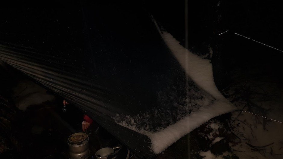 Det var ganske koseleg å sitja innunder tarpen, eta betasuppa og rundstykker medan det tromma med hagl/snø på tarpeduken. Eg synes vi (spesielt Jorunn) er blitt veldig god på å henga denne opp slik at vi kan sitja tørre innunder uansett ver. Ein anna ting ho er blitt veldig god på, er…