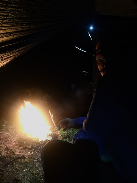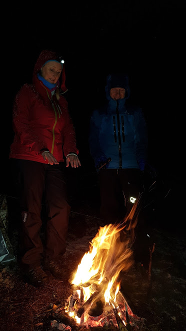 Det gjekk ganske kjapt å få opp denne, så då kunne vi (Jorunn og eg) krypa innunder og sitja å sjå på bålet som Svein Vidar hadde fått fyr på utanfor.