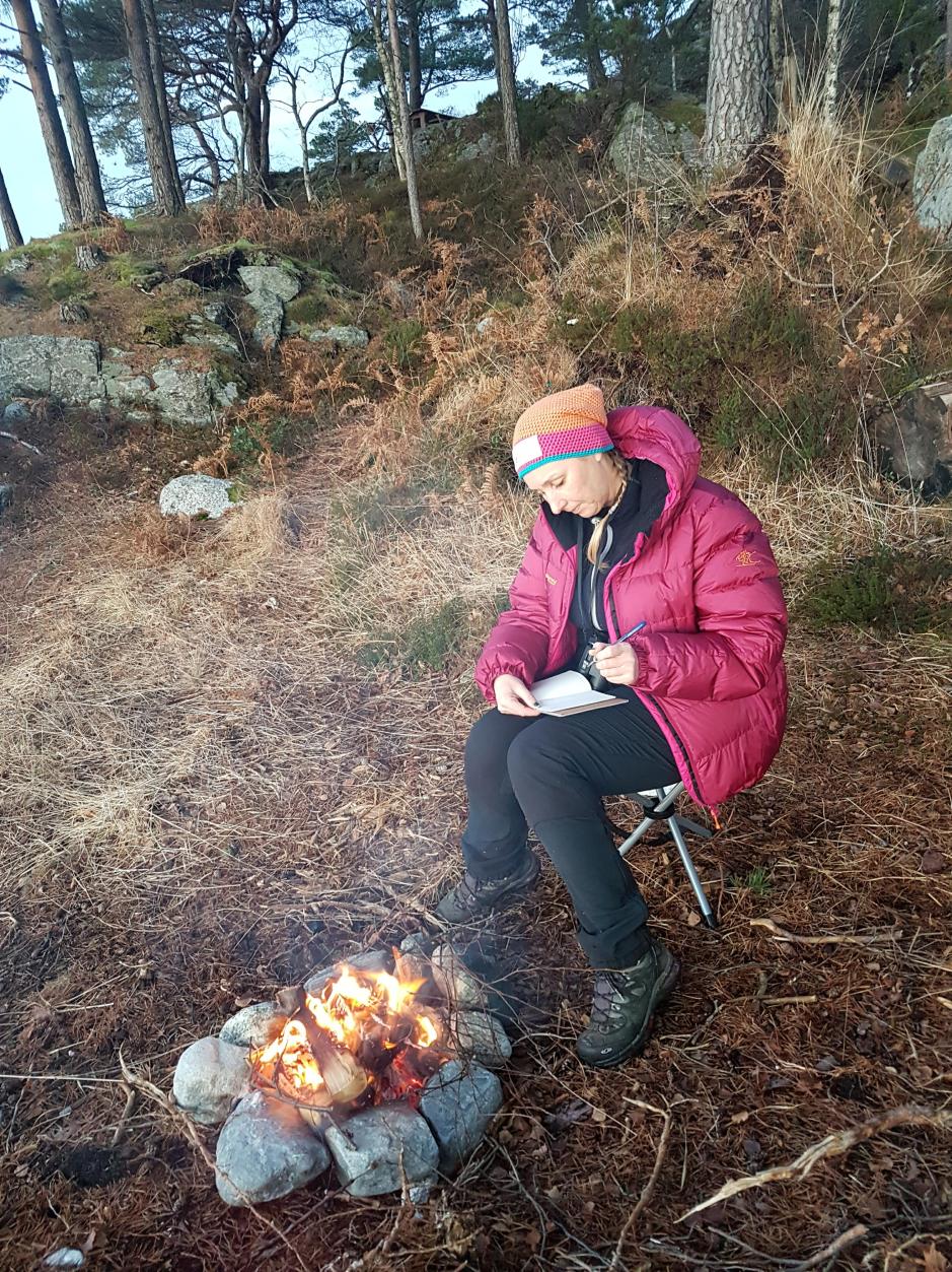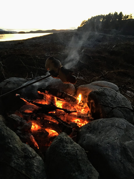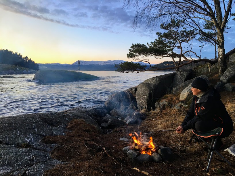 Fyrmeister Ann Irene fekk sjølvsagt raskt tent opp eit bål slik av vi kunne få grilla oss…