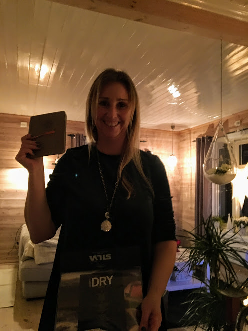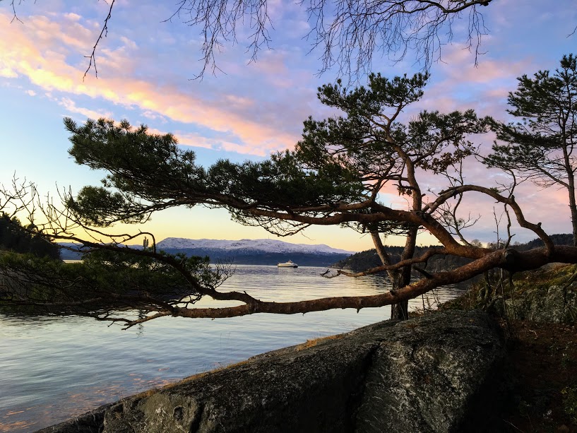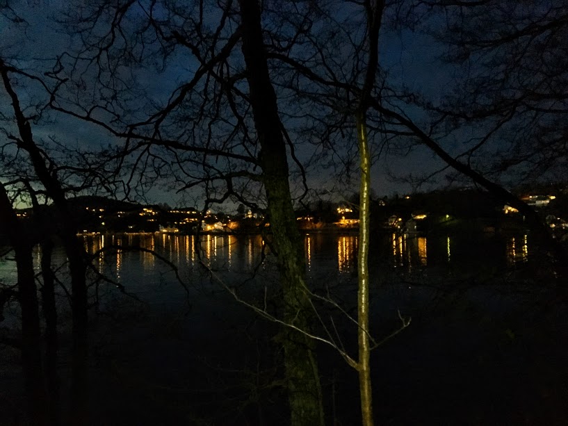 Vi kan vera glad for at eg hadde hovudlykt i sekken og lommelykt på mobilane. No vart det brått veldig myrkt, og på stien var det både glatt (det hadde byrja frysa på), vått og gjørmete. Vi hadde jo ikkje sett stien framfor oss utan lys – måtte ha sikta oss inn på lysa frå ferjekaien og snubla oss framover.