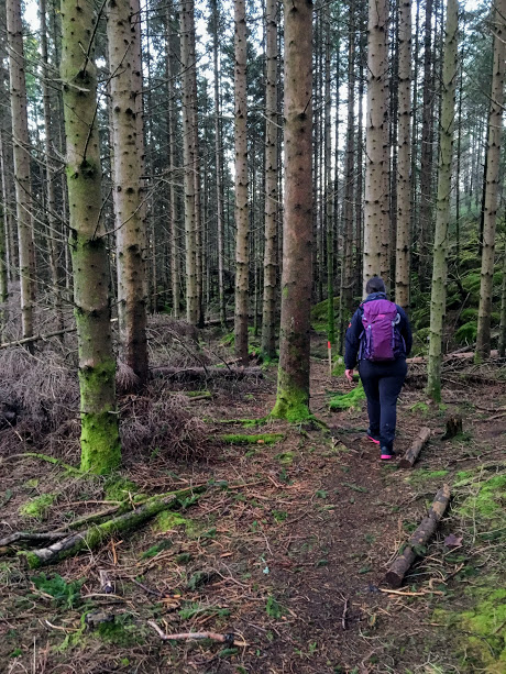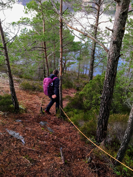 Etter ei stund tok av frå skogsvegen og la i veg på sti inni skogen. Eg la ikkje merke til noko skilt, men stien var i allefall merka med raude pinnar.