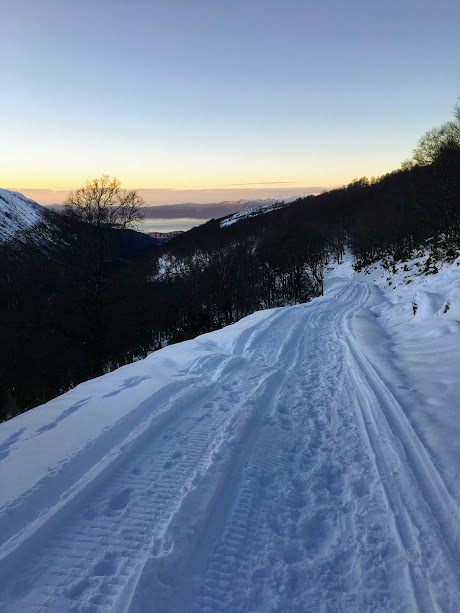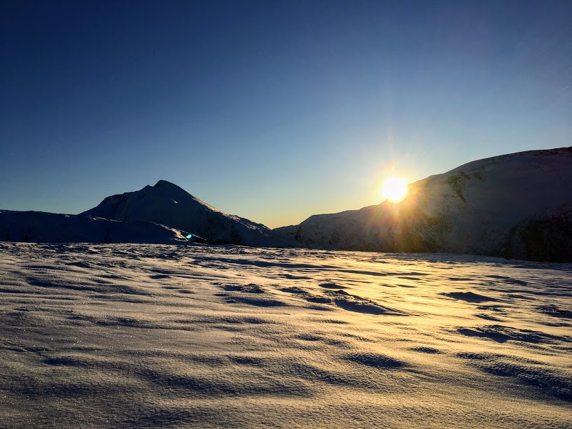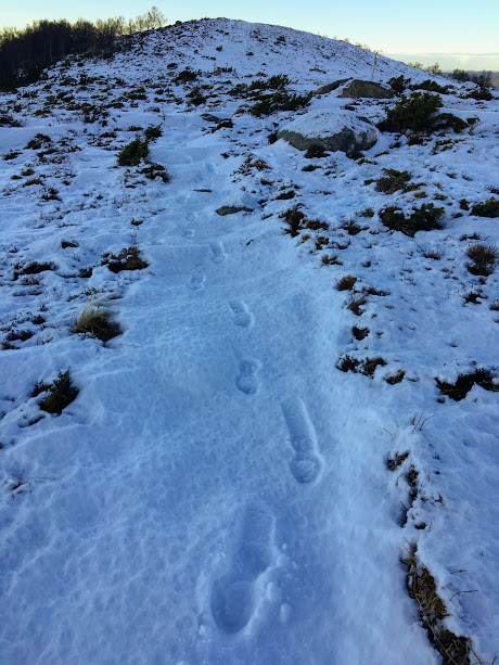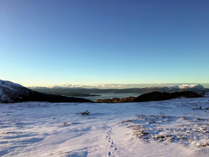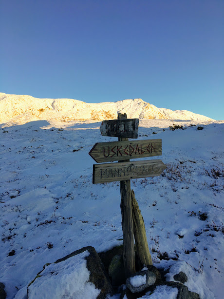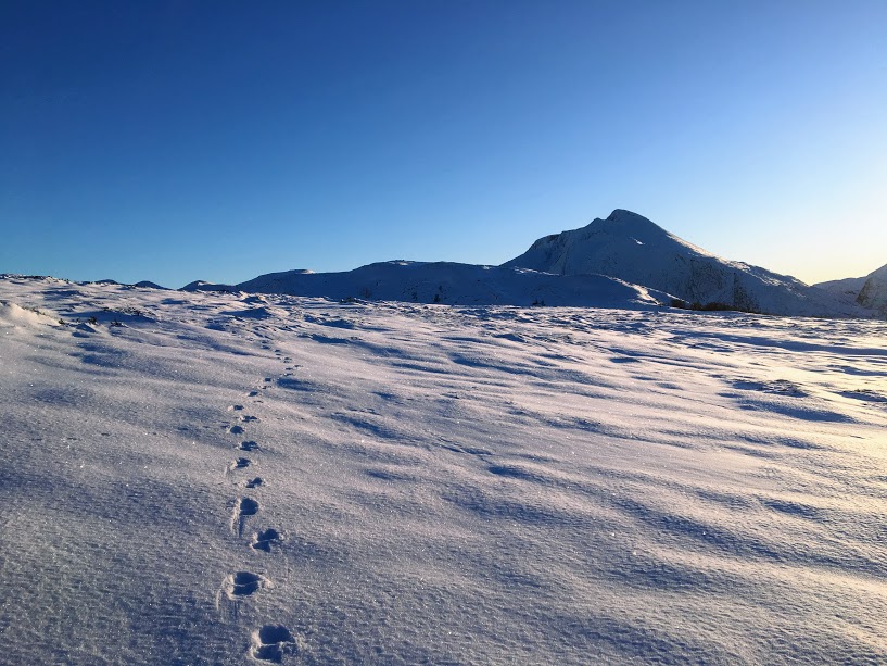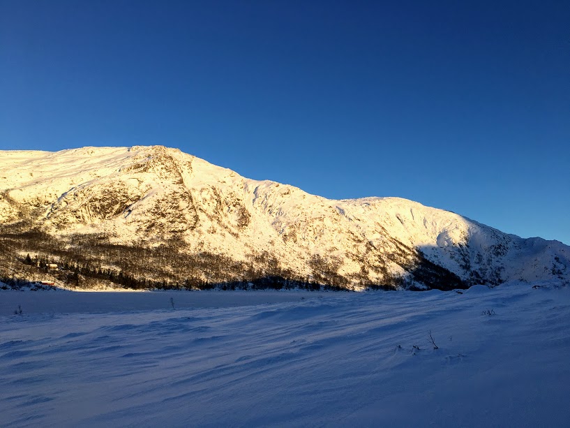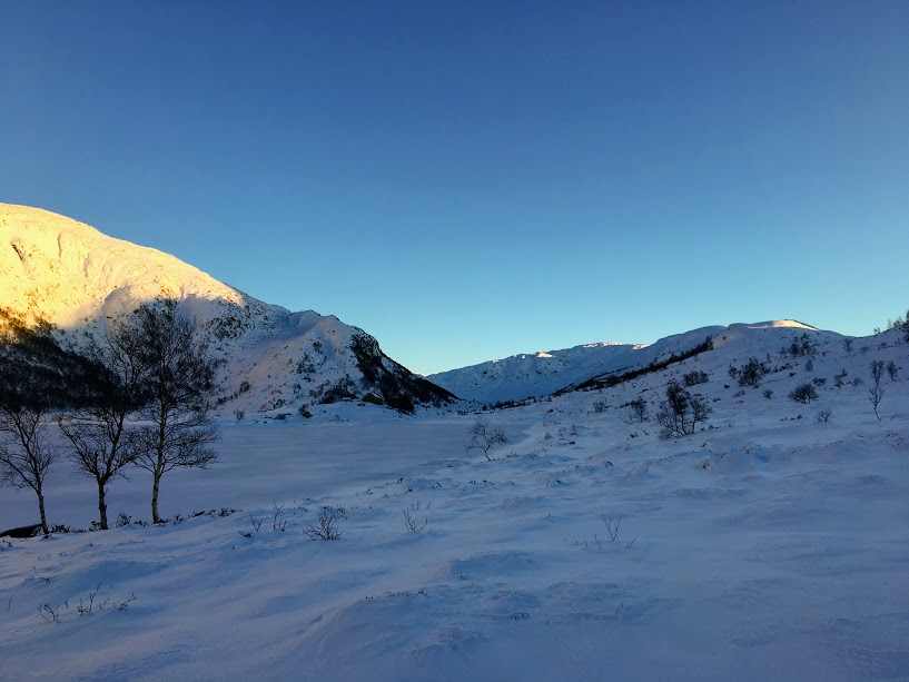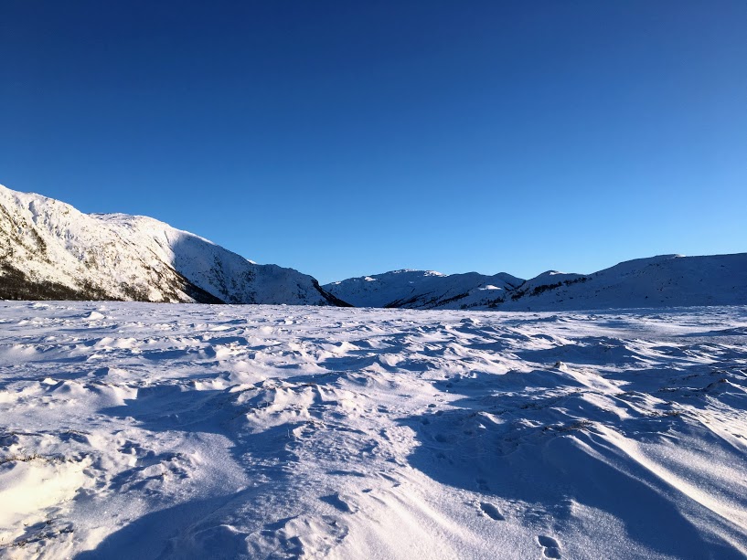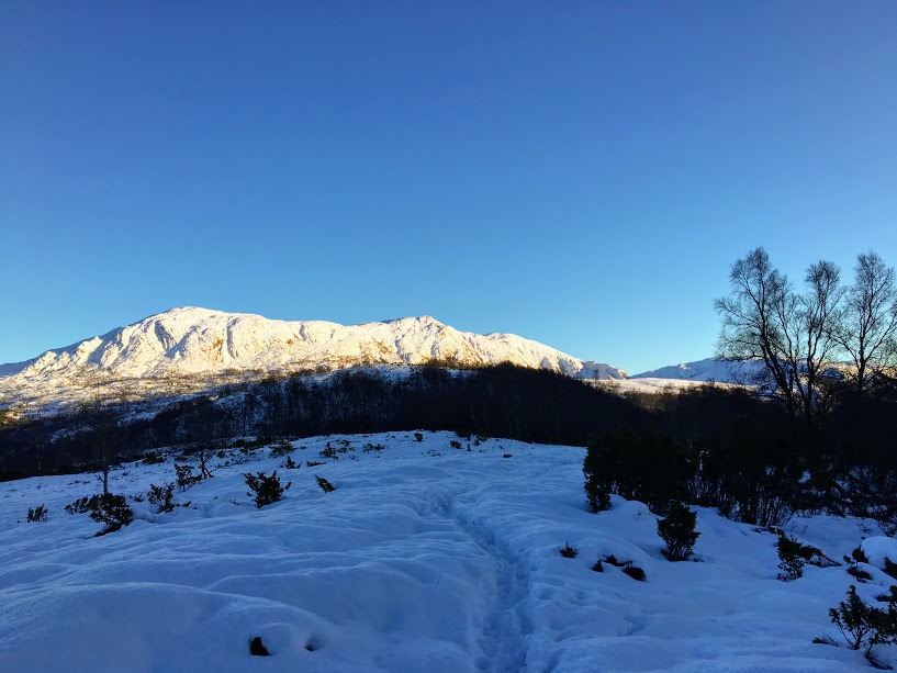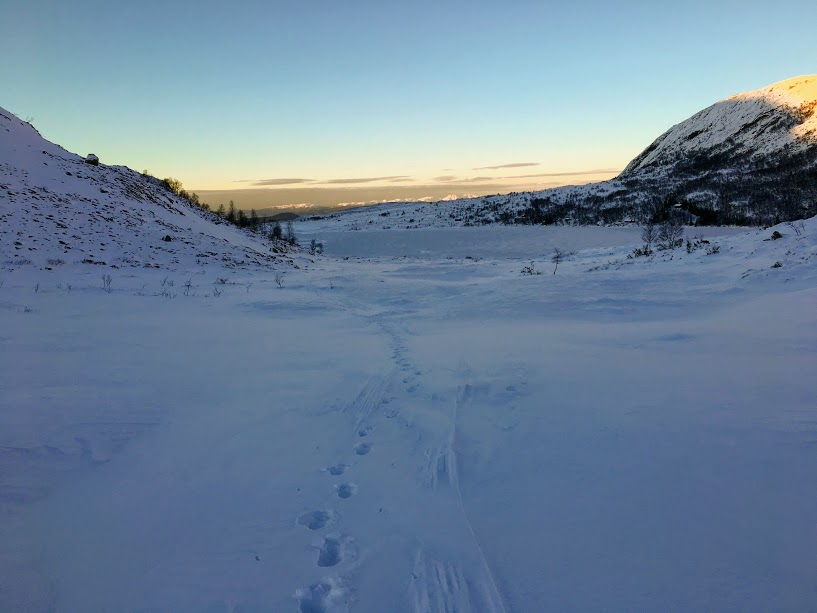 Eg traff på eit scooterspor nesten med eingong eg byrja å skråa opp fjellsida og det fylgde eg stort sett til eg kom over på andre sida av fjellet.