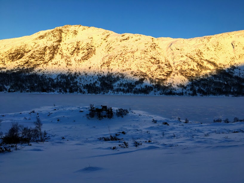 Eg trudde jo at det skulle vera kaldast og hard skare langs vatnet, men der tok eg feil. Her trakka eg igjennom snøen nesten heile vegen, og det vart rett og slett litt kavete å koma seg framover. Eg bestemte meg då for allereie etter å ha kome til hytte nummer to å skråa opp langs fjellsida i håp om at det var litt hardare føre langs fjellsida.