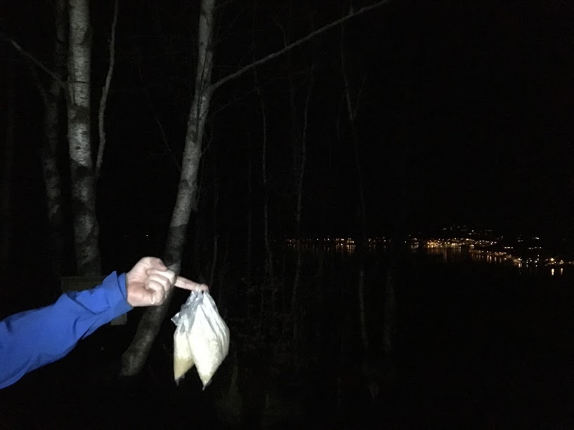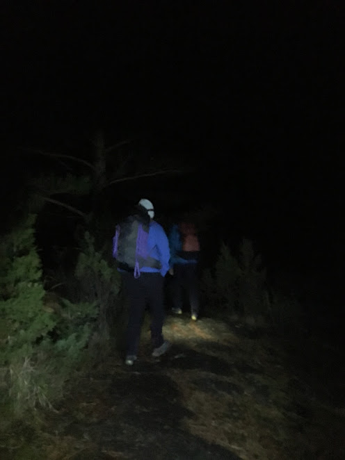 Jorunn foreslo å leggja turen til Høgåsen i Dimmelsvik – og då vart det slik. Maten skulle ho og ordna, så det einaste Ann Irene og eg hadde som oppgåva var å stilla på parkeringsplassen ved stien kl. 1800. Det skulle ein tru var ein enkel sak, all den tid eg har vore mange gonger på Åsen tidlegare. Men det har vore i dagslys! I går var det mørkt og ingen skulle trudd at eg hadde vore i området før – eg trur vi prøvde alle vegar inn, ut og opp i byggefeltet i Åsen. Ikkje var det noko hjelp i Ann Irene heller – det var 25 år sidan ho hadde vore i området 🙂 Til slutt var vi heldige og såg Jorunn og Svein Vidar koma kjørande – då kunne vi berre køyra etter dei til parkeringa og lata som ingenting 😉