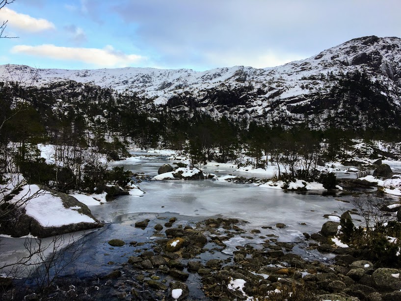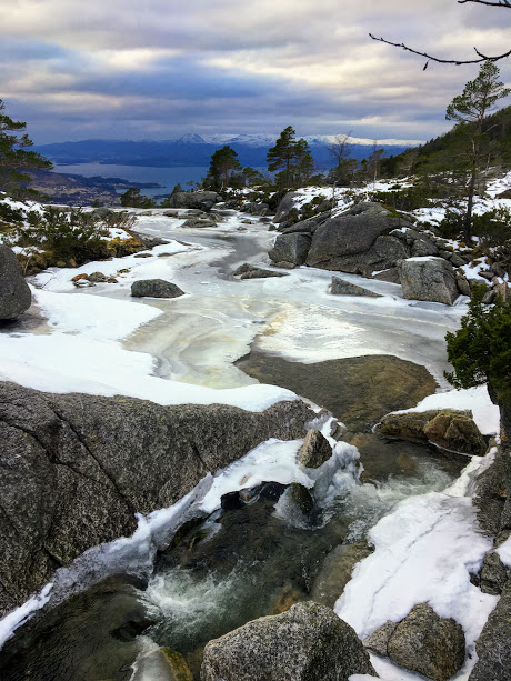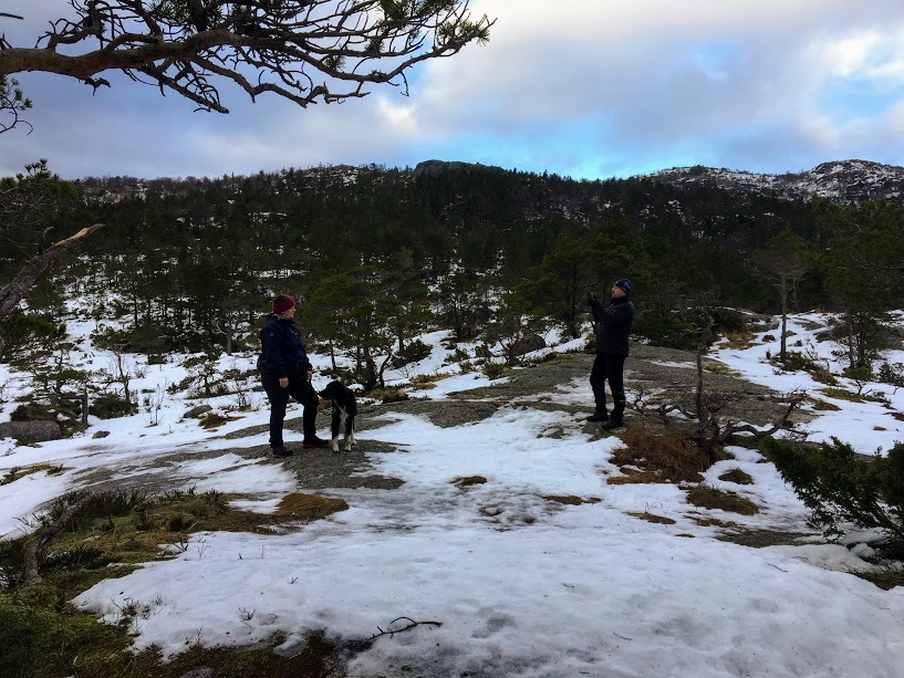 ….etterkvart vart det ganske isete og glatt. Det var ikkje så gale her kor vi kunne gå utanom stien, men snart kom vi opp i snø og, og då vart det litt utfordrande. Vi kunne med fordel hatt på brodder på skoa i dag. (At Ann Irene brått ligg bakerst her skuldast kun at ho vart preikesjuk med nokon som gjekk andre vegen 😉 )
