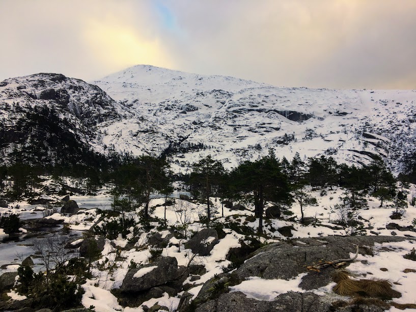 I dag stod Bremstølen for tur. Eg kikka opp på fjella og såg det var sol, og då skulle eg i allefall ikkje gjera det same i dag som i går – så eg kledde meg for ein litt sånn kald høsttur og ikkje vintertur. Eg angra på det allereie i bilen på ut – då eg såg det blas kvitt på fjorden….