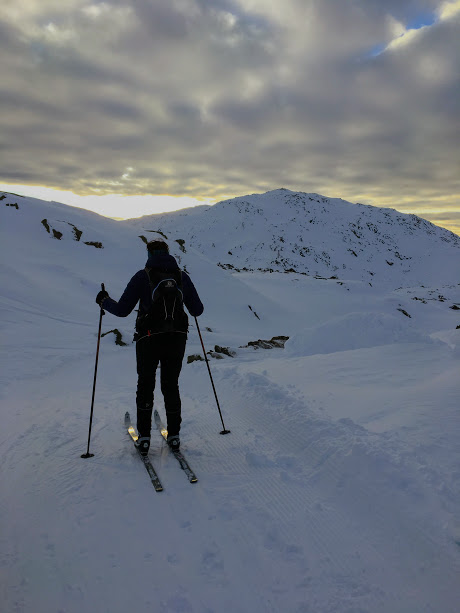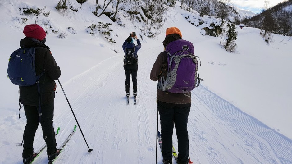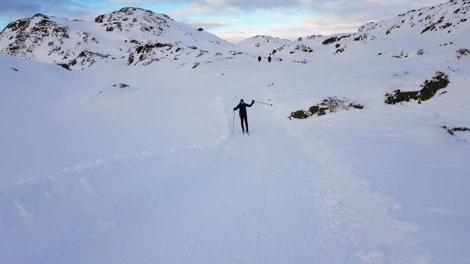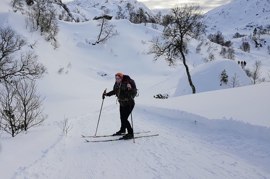 Her ser det ut som om eg er like pysete i oppoverbakkar som nedoverbakkar. Kortfellene mine klarar ikkje heilt å få meg opp dei brattaste bakkane, og ein og anna gong var det lettare å gå sidelengst i stadenfor i fiskebein. For ordens skuld – denne bakken er eg på veg opp og ikkje ned 😉
