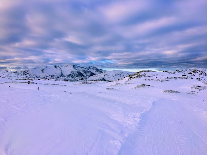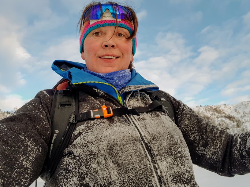 Eg hadde heldigvis pakka med meg både tørr ullgenser, buff, vottar og dunjakke i sekken – det fekk eg bruk for no. Eg var god og svett når vi sat oss ned og det var godt å få tørre, varme klede på 🙂