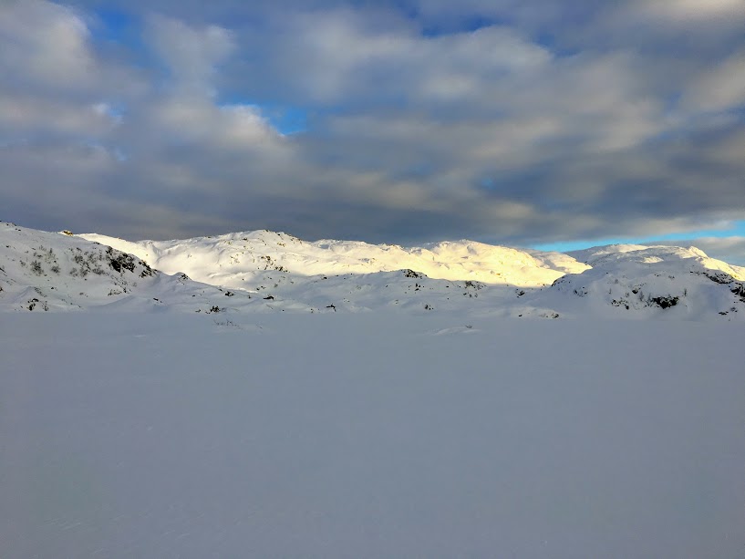 Eg har berre fylgd skiløypa rundt Reikatindane eit par gonger før og eg veit jo at det går på ned mot Nautavatnet når ein har kome på toppen. Eg hadde berre gløymt kor bratte nokre av bakkane var! Det var eit par gonger eg feiga ut og gjekk sidelengs ned og skia kom av ein gang og – sjølv om eg godt veit eg hadde klart å ploga ned. Men stort sett var eg nøgd med meg sjølv – det er ikkje meir enn eit par år sidan eg ikkje stod på ski nokon som helst plass kor tuppen på skia var lavare enn bakenden på skia 🙂