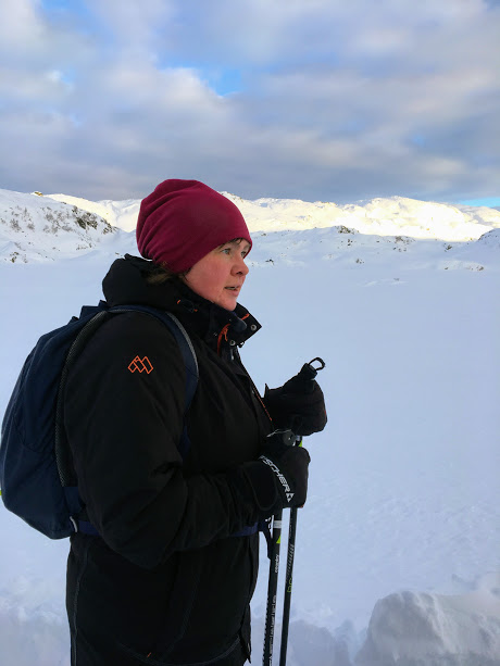 Alice er klar for å setja utfor den fyrste bakken ned mot Nautavatnet. Herifrå ser vi rett bort på Ingahogg!