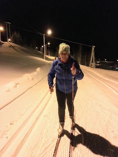 Nett når vi hadde byrja sjå på oss sjølve som nokonlunde habile og erfarne skiløparar så fekk vi vel i kveld ein liten knekk i den sjølvtilliten – iallefall eg. Jorunn hadde nemeleg bestemt at i dag skulle vi gå på løypeski i lysløypa. Eg hadde ikkje gått på sånne smale pinner dei siste åra og det var enda lenger sidan Jorunn hadde gjort det.