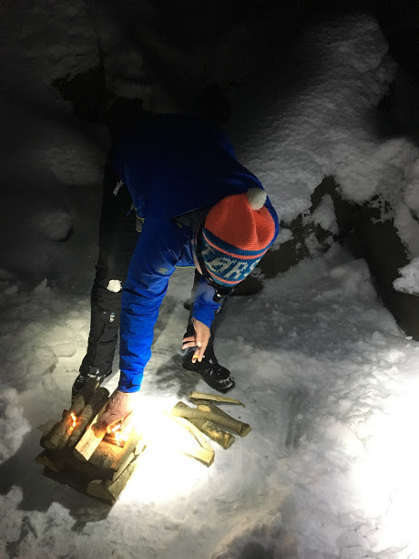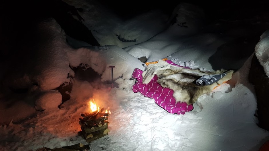 Voila – flott campplass 🙂 Kjekt med pulk, ser dåke, det er ikkje ofta vi har så mykje å sitja på når vi er på tur 😉