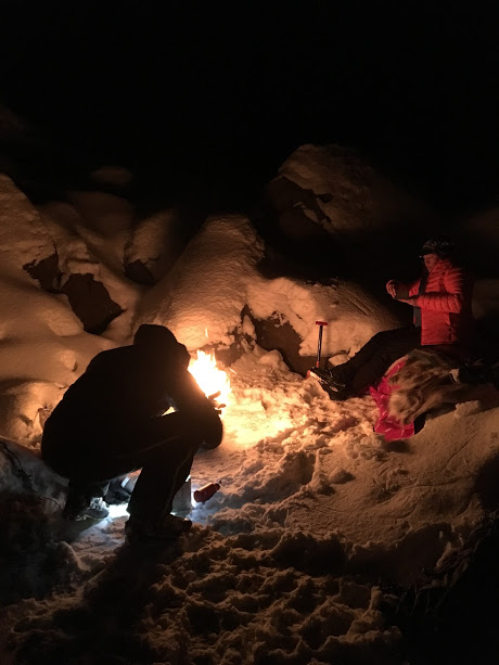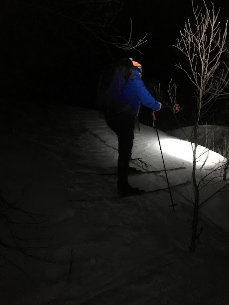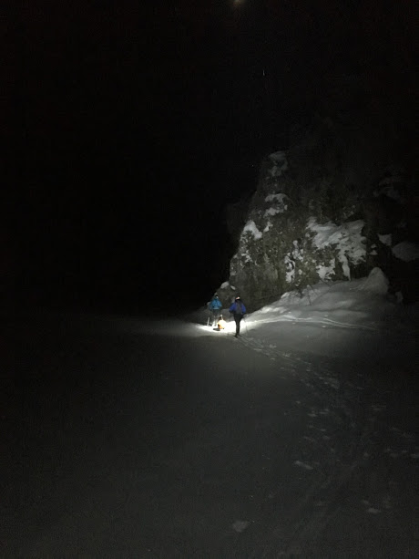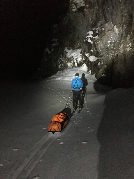 Når kakaoen var drukket opp var vi nøgde med kvelden, pakka i pulk og sekker igjen, og tok skia fatt tilbake til bilane.
