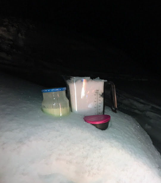 Dette hadde ho gleda seg til å prøva i lengre tid, så no skulle berre vi andre lena oss tilbake og venta på å bli servert varm kakao med softis på toppen. Men snart vart gleda snudd til fortvilelse – kor var saltet som skulle blandast med snøen???? Det er jo ein ganske vesentleg ingrediens når ein skal laga is i snøen. Etter litt leiting måtte vi innsjå at saltet stod igjen på disken heima 😦 Vi vart litt skuffa ei lita stund, men….