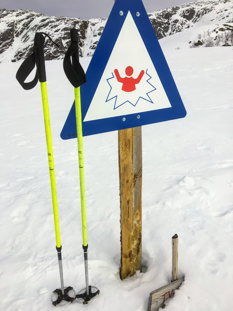 Det var nesten så eg ikkje hadde lyst til å gå heim att, men det måtte eg jo. Eg valgte å behalda trugene på heile vegen ned, og det var heilt supert! Då kunne eg gå rett fram og ned utan å tenkja på at eg kunne skli og brekka både armar og bein. Det var og blitt mykje blautare sidan eg kom opp, og slikt føre likar vanlegvis ikkje mine knær – skliing og vridningar er dei ikkje glad i. Men trugene var heilt stødige og knea haldt kjøreretningen heile vegen ned 🙂 Det var den beste turen ned i frå fjellet eg har hatt nokon gong, trur eg – uavhengig om det er vinter eller sommar 🙂 Eg vart nesten litt sur når eg kom ned i siste sving og det var slutt på snø og is 🙂