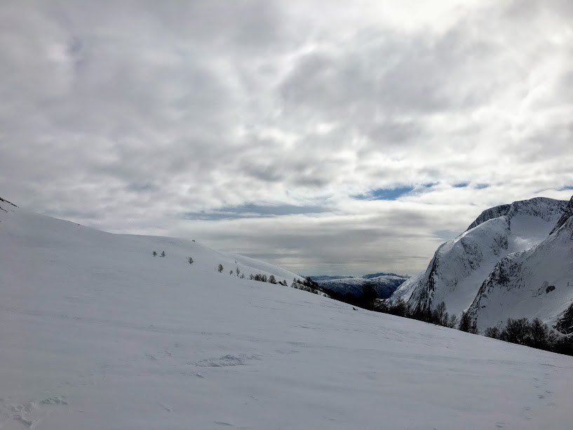 Eg bestemte meg fyrst for å gå mot Tverrfjell – det såg mykje lysare ut den vegen enn andre vegen. Men eg kom ikkje så veldig langt før eg snudde å gjekk andre vegen. Eg har klart å somla vekk skibrillene mine og går no rundt til fjells med eit lite flatterande solbrillepar – som slett ikkje funkar mot flatt lys. Og det vart ganske flatt lys mot Tverrfjell. Og så måtte eg vedgå for meg sjølv at eg hadde jo aldri ha gidda å gå heilt til Tverrfjell åleina – eg er blitt litt for godt vane med å ha med godt turselskap.