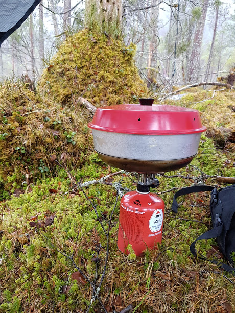 Jorunn heiv seg rundt og fekk opp sin tarp og fyrte igang Omiaovnen. Ja, vi synes og vi har dratt det litt langt når den får eigen tarp 😉