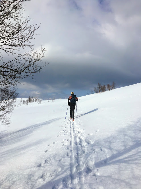 Då la eg nemleg i veg på ski opp – ja, nettopp – Pålavegen igjen 🙂 Det var litt uventa, men det vart så varmt og fint når vi gjekk på opp at vi måtte hiva jakkene og kun gå i ullgenser – og så måtte vi ta på solbriller :-).