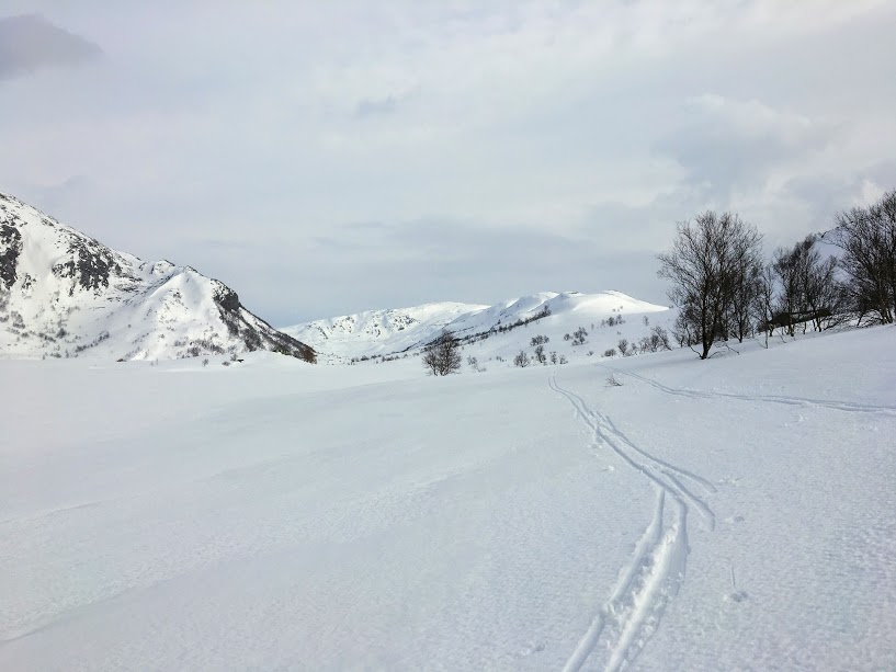 Vi enda på at turen skulle gå til Ænesdalen. Ingen av oss (og ja, eg synes det er litt flaut) hadde gått inn dalen på «Laksepark» sida før, så då bestemte vi at vi fekk sjekka ut korleis det var. For min del var det greit at vi gjekk litt utanfor allfarveg i dag. Eg hadde nemleg ignorert at eg hadde fått eit stort gnagsår på eine vetletåa – det gjekk fint heilt til eg skulle ta på sko. Det gjekk ikkje så bra. Men å avlysa turen? Ikkje aktuelt! Til slutt enda eg med at skiskoa var det einaste som gjekk an å ha på – så då gjekk eg turen i dag i skisko og med skistavar…..
