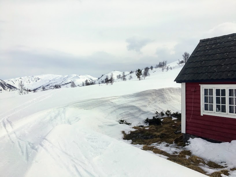 Det er store forskjeller i snømengdene her. Det vil nok ta litt tid før snøen forsvinn heilt rundt denne hytta, medan…