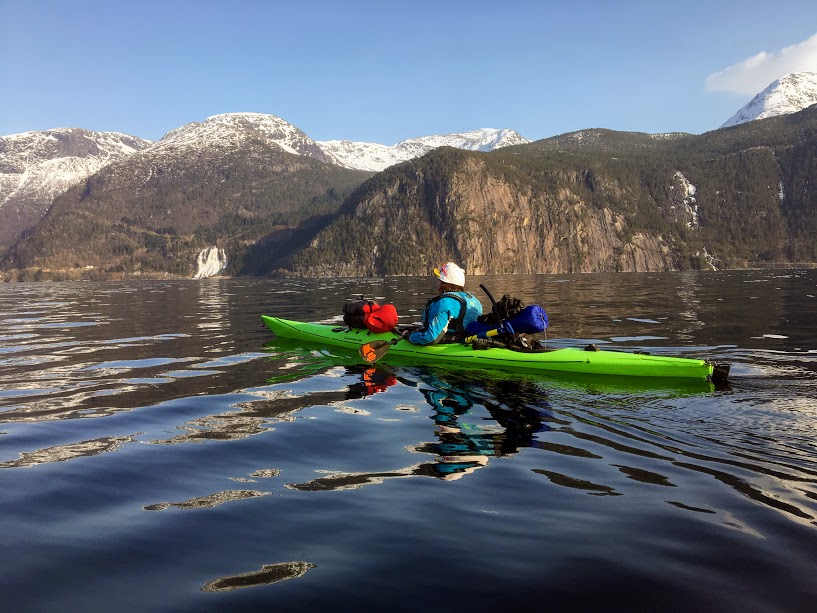 Eg mista fort oversikten over kor Jorunn befann seg og eg turde ikkje snu meg for å sjå kor ho var. Eg håpa berre at ho ikkje hadde snudd å padla tilbake til Ænes 😉 Sjølv padla eg kun med venstrearmen for å klara å halda nokonlunde retninga mot Maurangsneset. Høgrearmen brukte eg berre til å korrigera retninga med av og til. Takk gud for alle skiturane eg har vore på i vinter og opparbeid meg armmusklar 😉 Kajakken og straumen var heilt bestemt på at eg skulle mot Jondal – eg stritta i mot! Ei stund tenkte eg at dette ikkje kom til å gå – eg fekk berre styra med straumen så fekk eg heller ringja nokon som kunne henta meg i Jondal eller deromkring 🙂 I ettertid slo meg at eg ikkje berre hadde padla heile strekninga med kun venstrearmen – eg sat i tillegg å skubba venstrepedal så langt inn det gjekk heile turen. Den styrer roret mot venstre – altså same veg som straumen ville ta meg med…. Snakk om å motarbeida seg sjølv, men denne megatabben kjem eg aldri til å røpa til nokon 😉