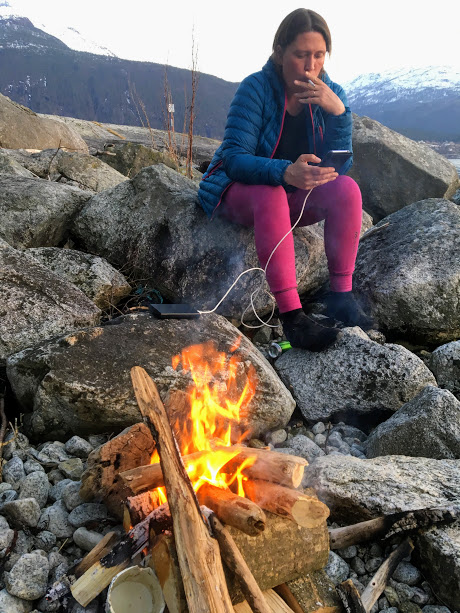 Men vent litt – kva var den lyden?? Den summinga eg høyrte? Er det andre folk i nærleiken? Så gjekk det opp for meg – Jorunn låg på svaberget i soveposen sin og såg på Netflix på mobilen sin 😉 Den summinga + buldringa frå Furubergsfossen sovna eg omsider inn til 🙂