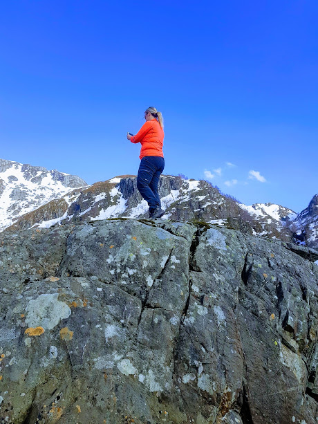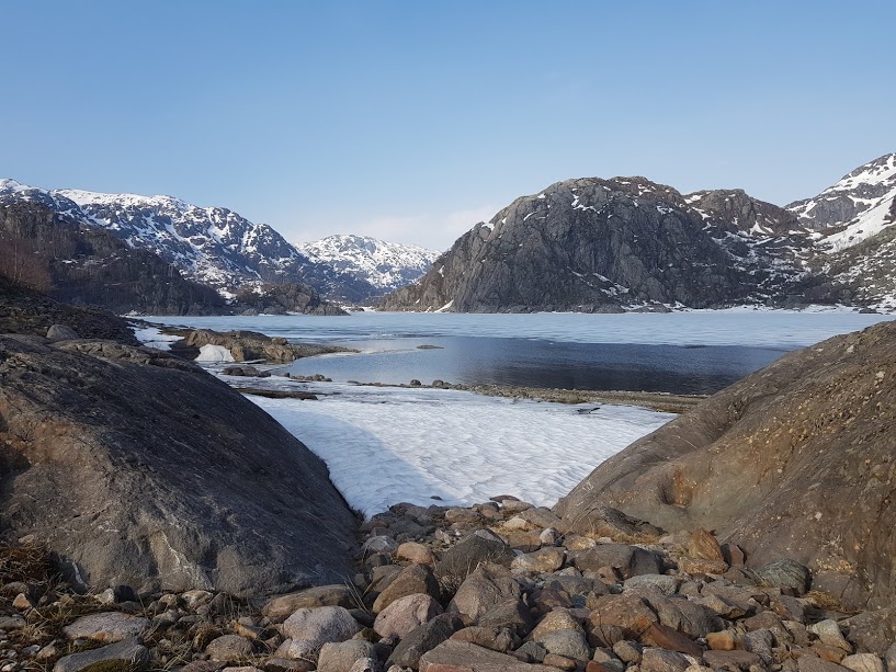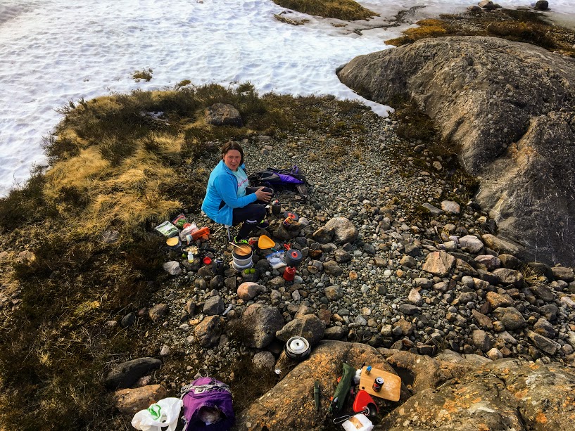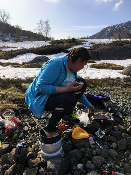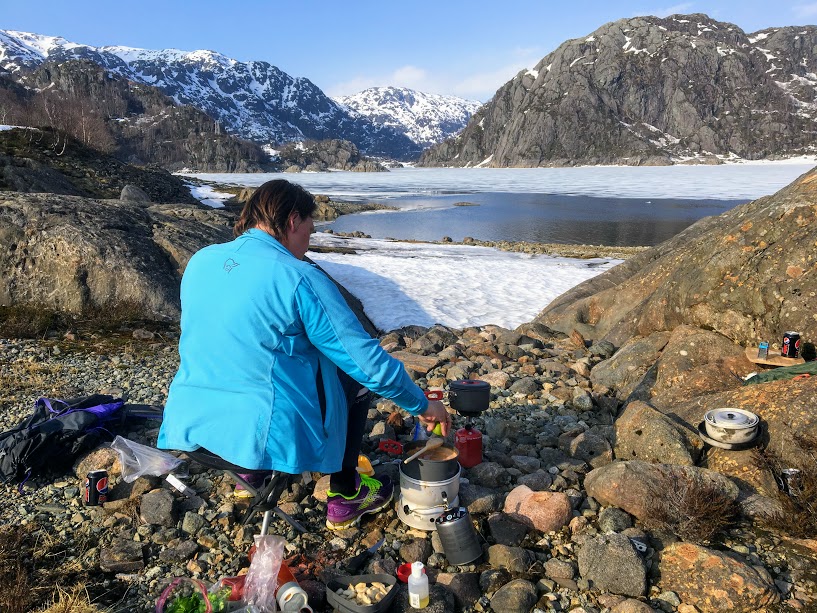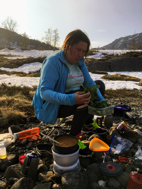 Jorunn heiv seg i gang med suppekokinga – og hadde vakker utsikt over Staffivatnet 🙂 Det er nok ei stund til vi kan padla der enda, men det minkar godt på både is og snø.