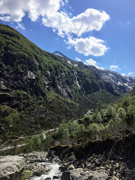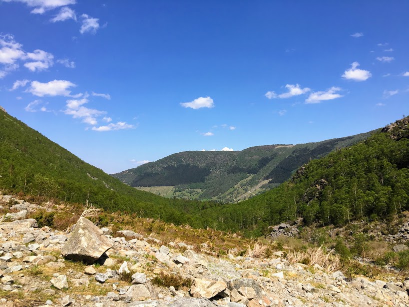 Vel nede på stien valgte eg å fylgja den litt vidare innover dalen. No smalar det til, og eg var, om eg kan skriva det, ganske heit etter å ha forsert ei kvit steinrøys opp og ned og bortover i alle vinklar – det var/er jo ikkje direkte kaldt i dag.