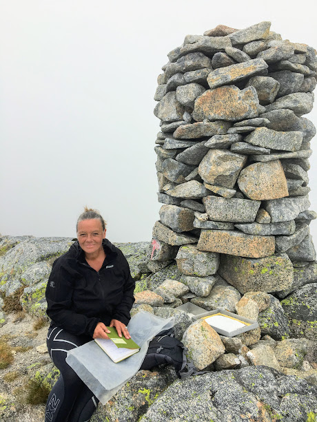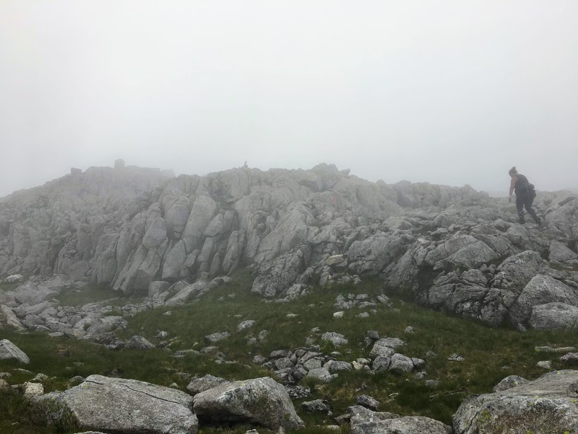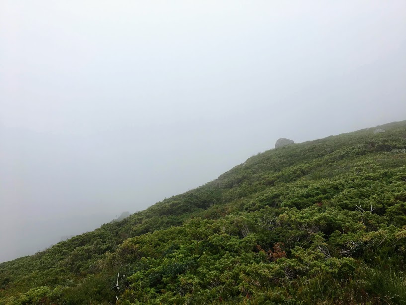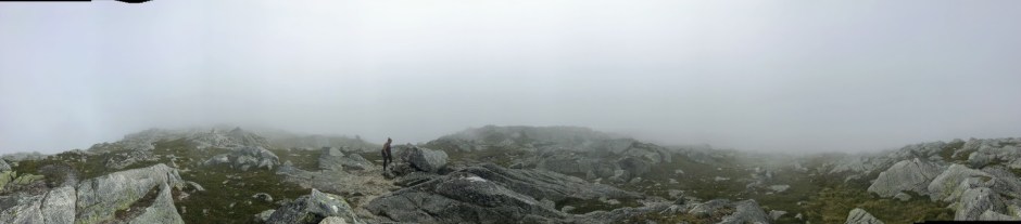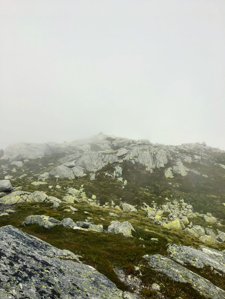 Vi fann stien og då var det berre til å fylgja den oppover nokre småtoppar. No var vi heilt sikre på at det bar strake vegen til Tverrfjell – sjølv om vi ikkje såg så mange meter framfor oss.
