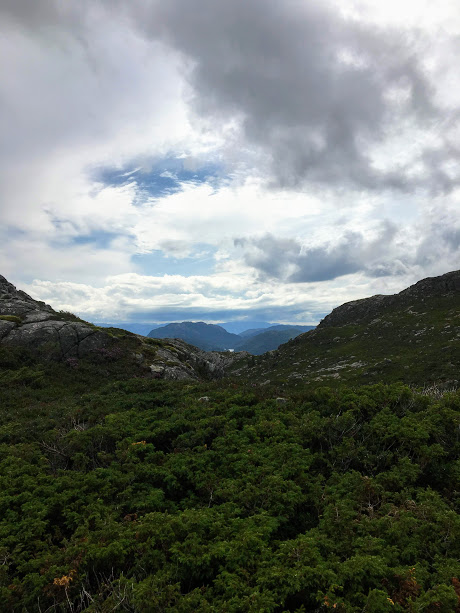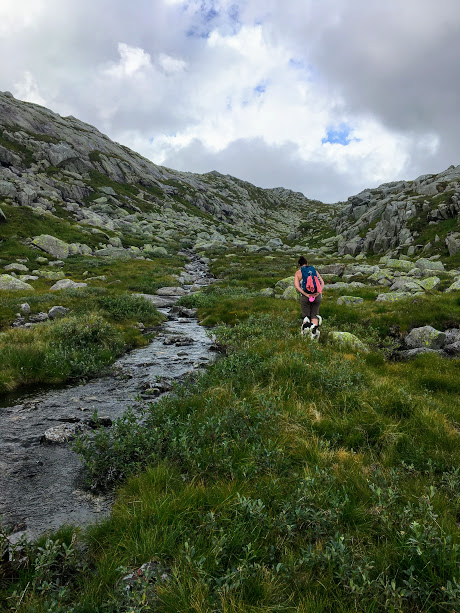Det var lurt å halda seg oppe i høgda for då vi kom rundt siste «sving», såg vi at vi var på veg inn i ein liten dal. Her var det idyllisk å fint å gå 🙂 Her bestemte vi oss og for å ta ei matpause, fann oss ein stein, snudde oss og…
