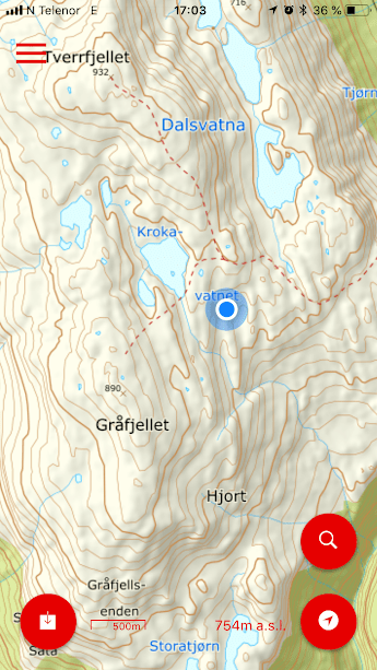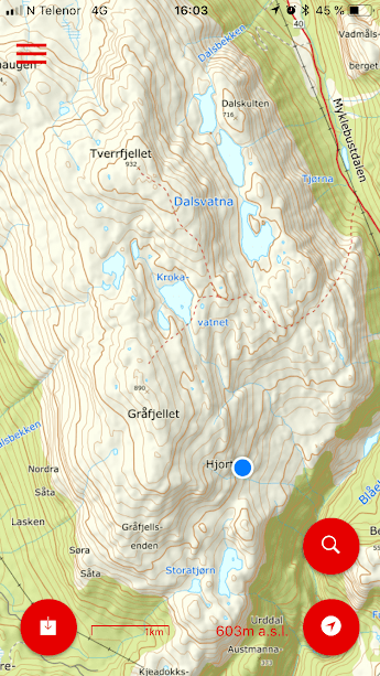 No fekk vi dekning på mobilane att, og har dåke sett – i fylgje Norgeskart stod vi no midt på Hjort 😉 Hvis vi berre haldt retninga no, kom vi omsider til å treffa på stien som kom opp på Omvikdalsida. Vi tok sikte mot den, men tenkte og at om vi såg ein snarveg til Gråfjell tidlegare, så kanskje vi skulle satsa på å koma oss opp dit.