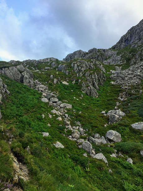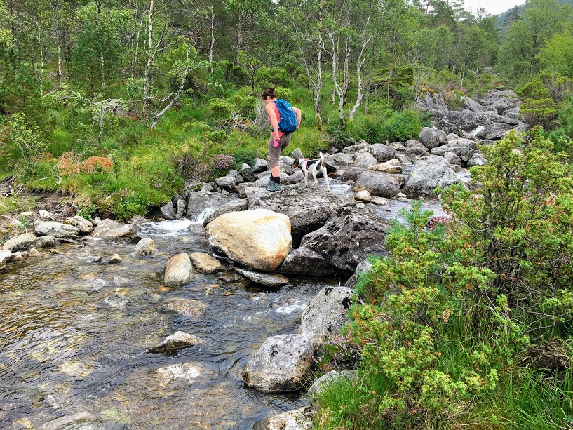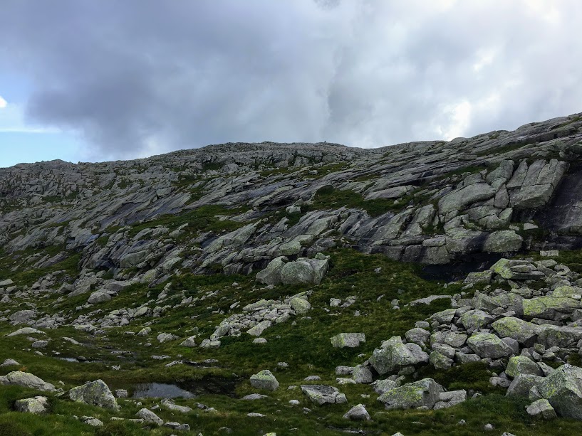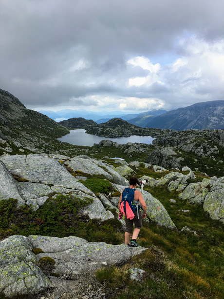 Det var ingen synleg sti her, men framleis fann vi steinar som vi innbilla oss viste veg. Uansett så bestemte vi oss for å klyva opp ei fjellsida og halda oss litt i høgda.