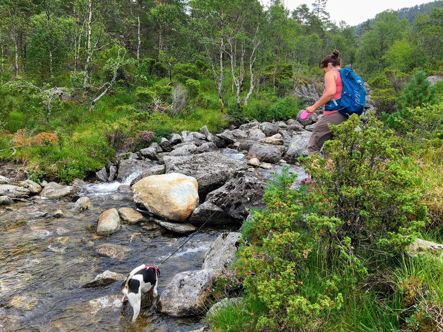 Her er vi så vidt kome igang med turen og har berre fylgd skogsvegen bak den siste fjellgarden på Fjellandsbø nokre få meter. Framom oss skimta vi kyra midt på skogsvegen, og dei ville ikkje Magnhild at Max skulle få helsa på – så vi skar ut i skauen. Så allereie her var vi på nye stiar… (Magnhild på to bein, Max på fire 😉 ).
