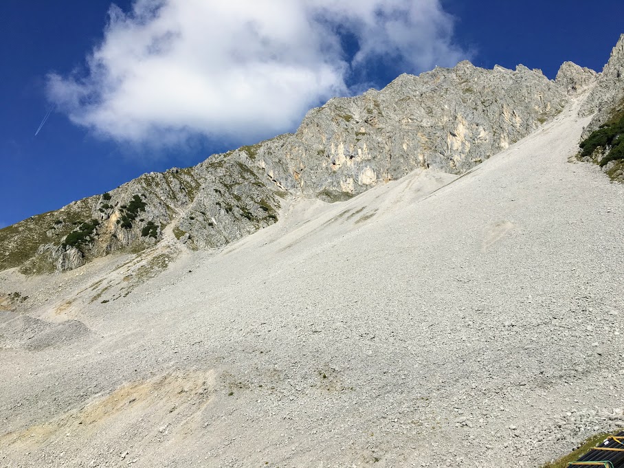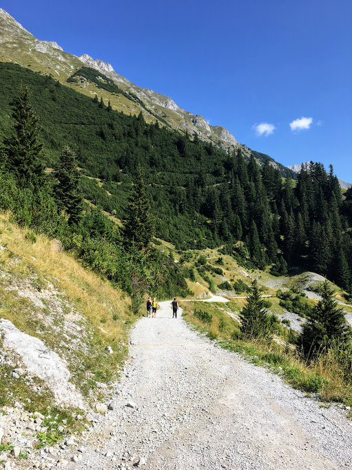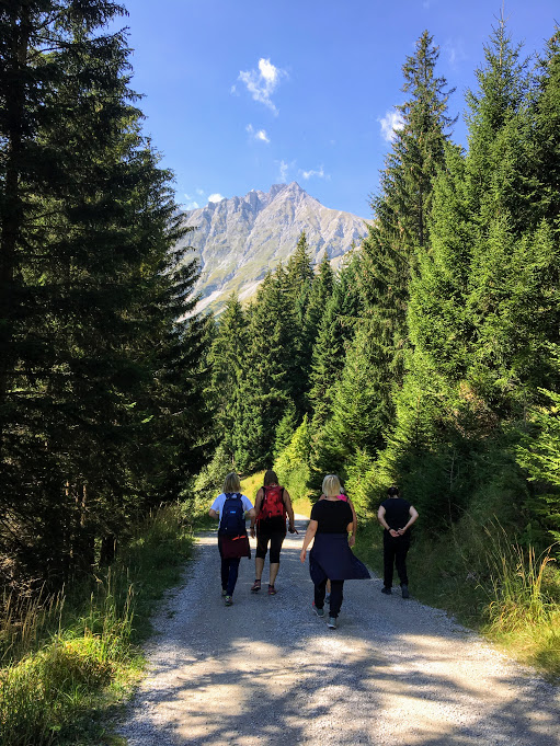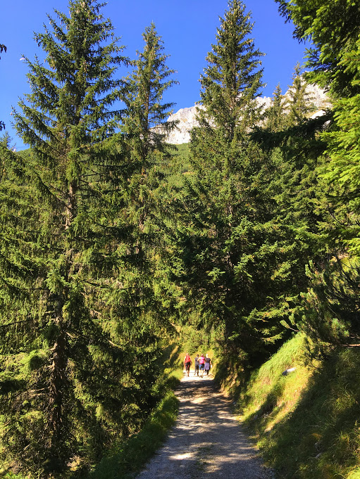 Det går faktisk an å ta banane ned att i frå fjellet óg, men det var ikkje noko alternativ for oss. Sidan to av dei svenske damene hadde fly heim frå Munchen om kvelden, og måtte forlata oss om ettermiddagen, valgte vi å gå grusvegen ned mot Bodensteinalm iom at den såg kortast ut.