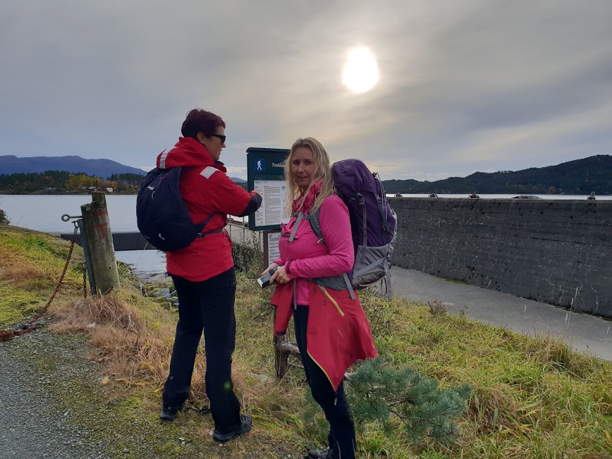 Allereie ved starten av løypa valgte vi å sjå vekk i frå mitt kart og anvisning. Det viste seg at vi var litt for sjenerte til å trø rett igjennom tunet til folk. Vi køyrte difor ned på ferjekaien på Sydnes og starta turen….