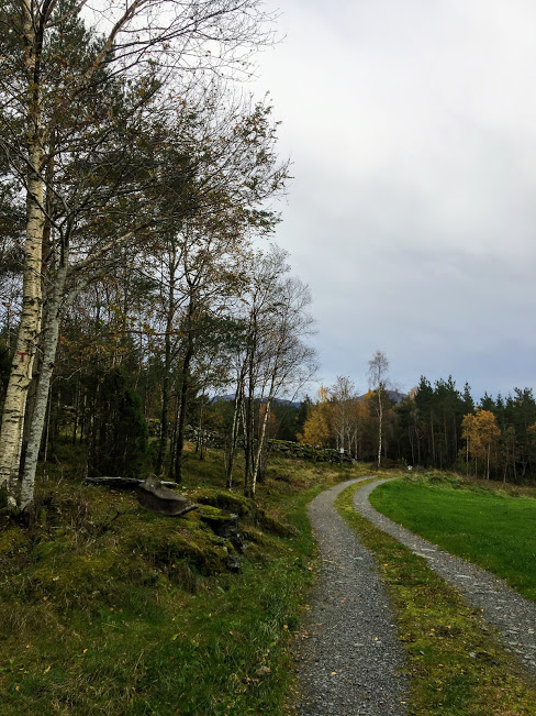 No visste vi jo kor vi var og kor vi skulle gå tilbake. Vi bestemte oss for å vera litt tøffare på tilbakevegen, skippa skogen og fylgde traktorvegen rett igjennom tunet til ein gård og ut på hvoudvegen. Då var det berre ein kort spasertur…