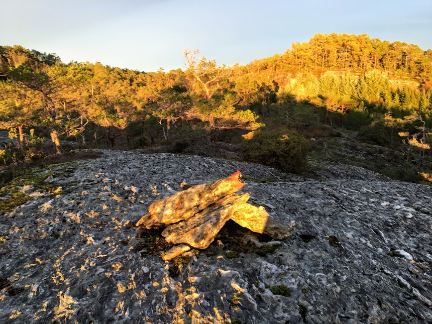 Det var jo fint når vi kom opp i «høgda» igjen. Masse berg og små furu. Vi bestemte oss for å finna ein fin plass vi kunne innta middagen før vi evt. fann ein sti å fylgja ned att.