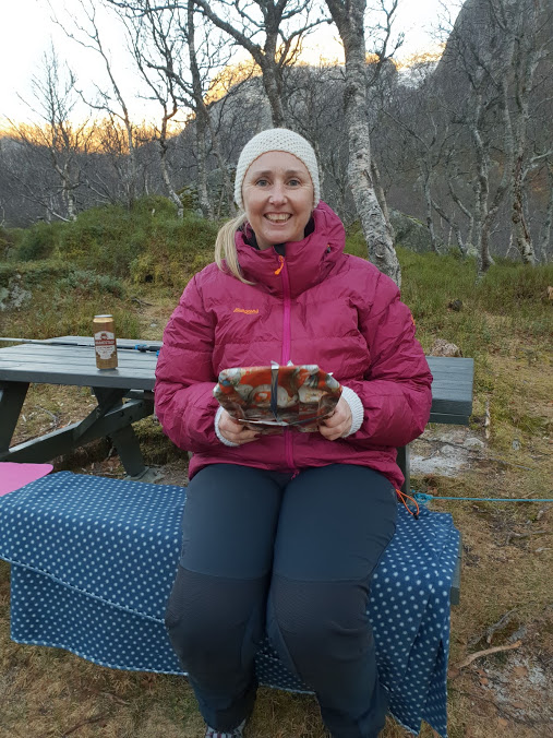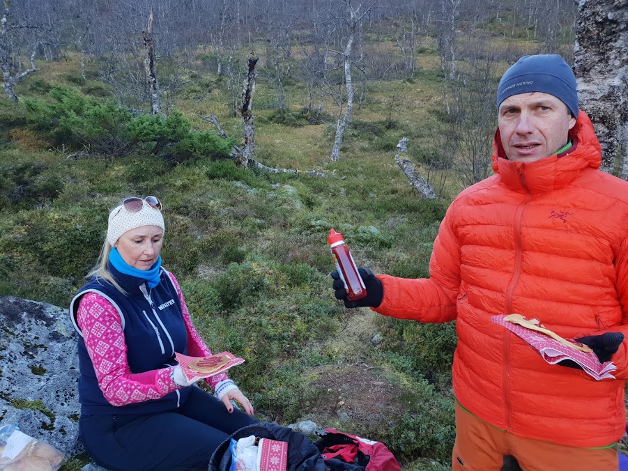 Her tok vi ei lita pause. Kosa oss med solbærtoddy, kakao og lappar. Ja, og så fekk Svein Vidar eta opp resten av multekremdesserten frå kvelden før 🙂