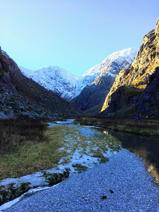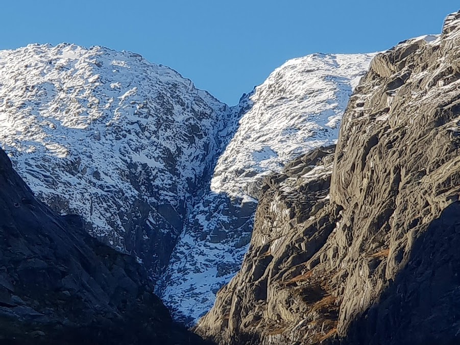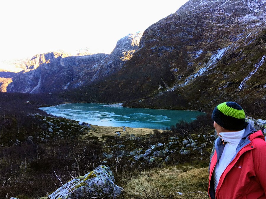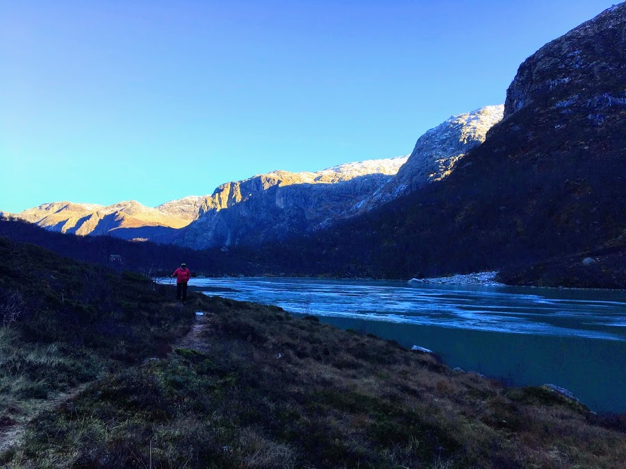 Det siste stykke var det kjempefint å gå å sjå på snødekte fjell med sol på toppane 🙂