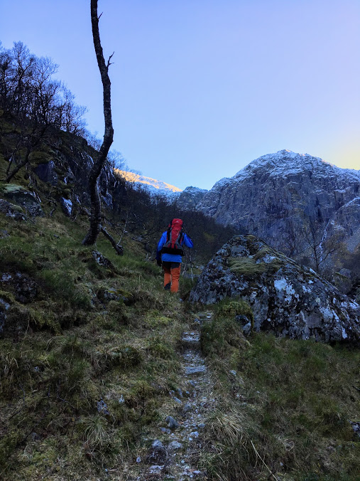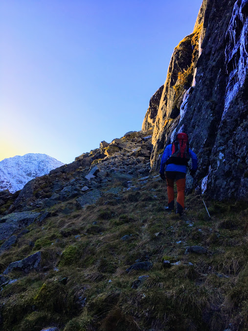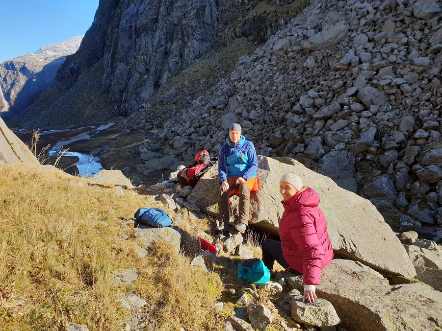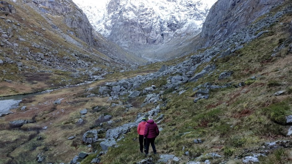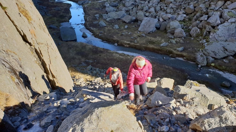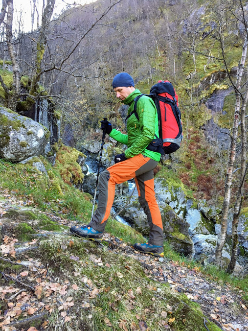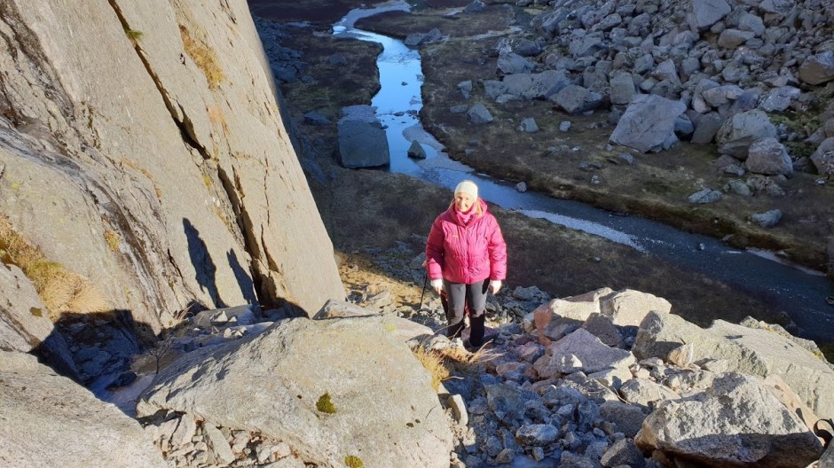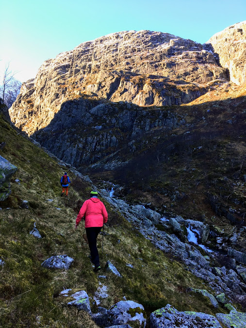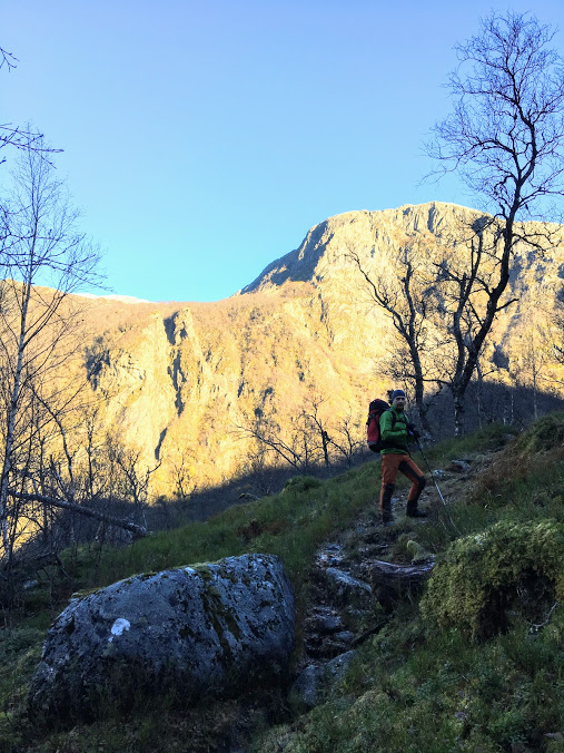 Svein Vidar kikkar opp mot Gardshammar som badar i sol. Vi, derimot, skulle fortsetja på skuggesida 🙂