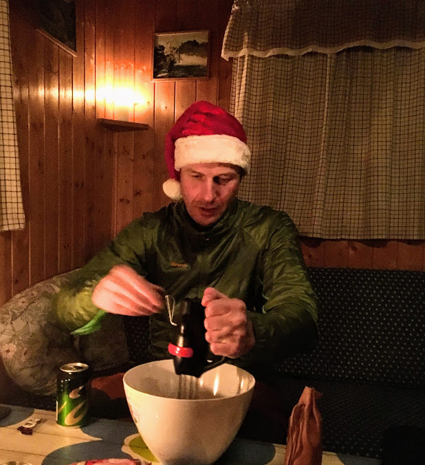 Ååå, det var godt å koma fram og få setja i frå seg sekkane. Svein Vidar gjekk straks i gang med å ta skoddene vekk i frå vindauga, fiksa pipa, henta ved, fyra i omnen, henta vatn etc. etc. Jorunn og eg slappa av og plukka fram ein ny tradisjon i frå sekkane…
