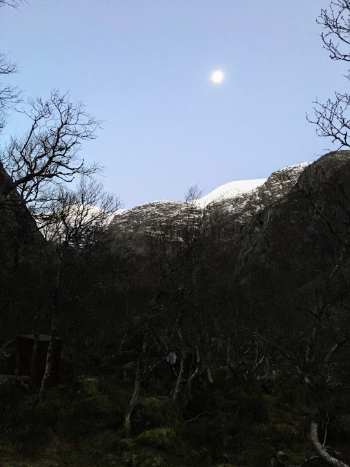 I fjor kom vi oss avgårde litt seint, slik at det var mørkt når vi kom fram. I år byrja vi noko tidlegare på dagen, slik at vi skulle rekka inn til hytta utan å måtta bruka hovudlyktene våres 🙂