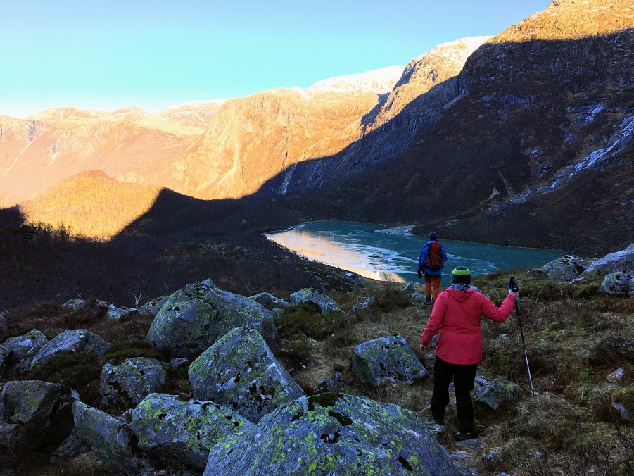 Eg kom fyrst ned stien. Dei andre kom litt etter og påstod eg hadde dansa så elegant nedover stien. Men eigentleg så var eg så lei at eg dreit i stien og berre såg etter kva trer eg kunne halda/klamra meg til nedover. Om det såg elegant ut trur vi får skulda det på skumringa 😉