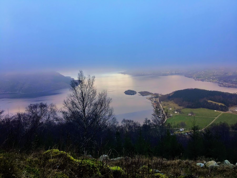 Skogsvegen svingar rundt fjellet slik at ein etter ei stund kjem rett ovanfor sandtaket i Dimmelsvik. Eg hadde trudd at når vi kom oppover her skulle bevega oss igjennom tåka, men det kom aldri noko tåke vi måtte gå igjennom. Det einaste vi såg var den vetle tåkedotten midt i bilete her.