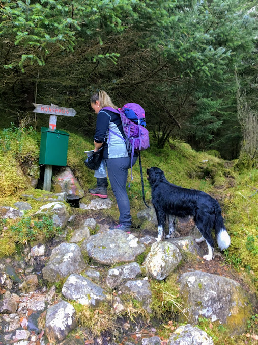Omsider var vi ferdige med skogsvegen og kunne skriva oss inn i boka før vi fortsatte resten av turen på sti.