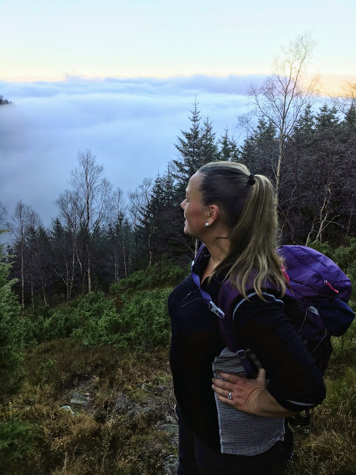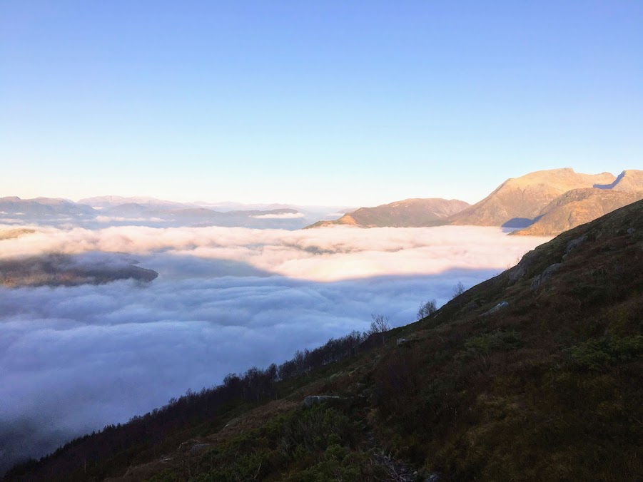 Eg kikka spent ut vindauga då eg vakna på søndag – var det tåke?? Jepp, det var det. Den låg like langt nedover fjellsidene som på laurdag. Den skal eg over, tenkte eg 🙂