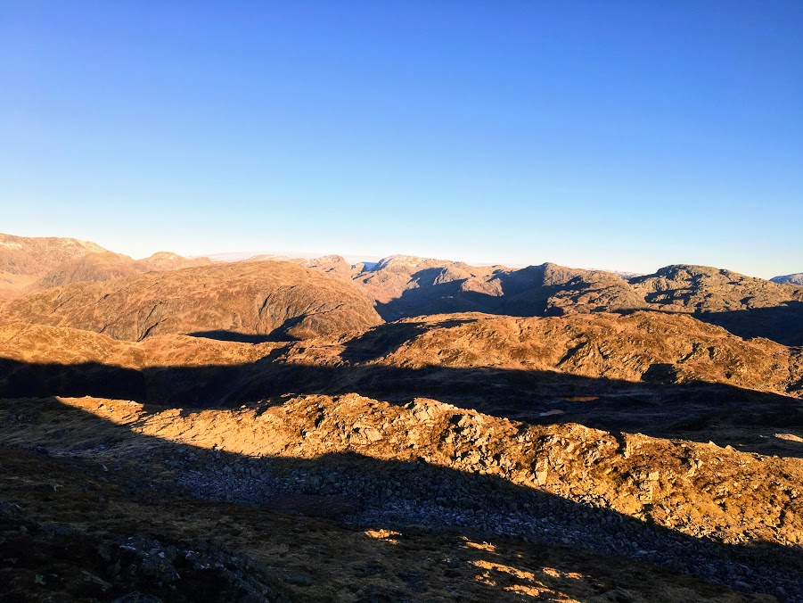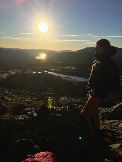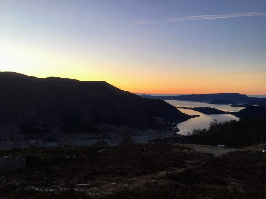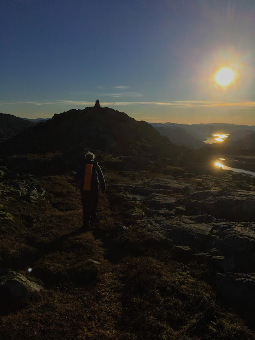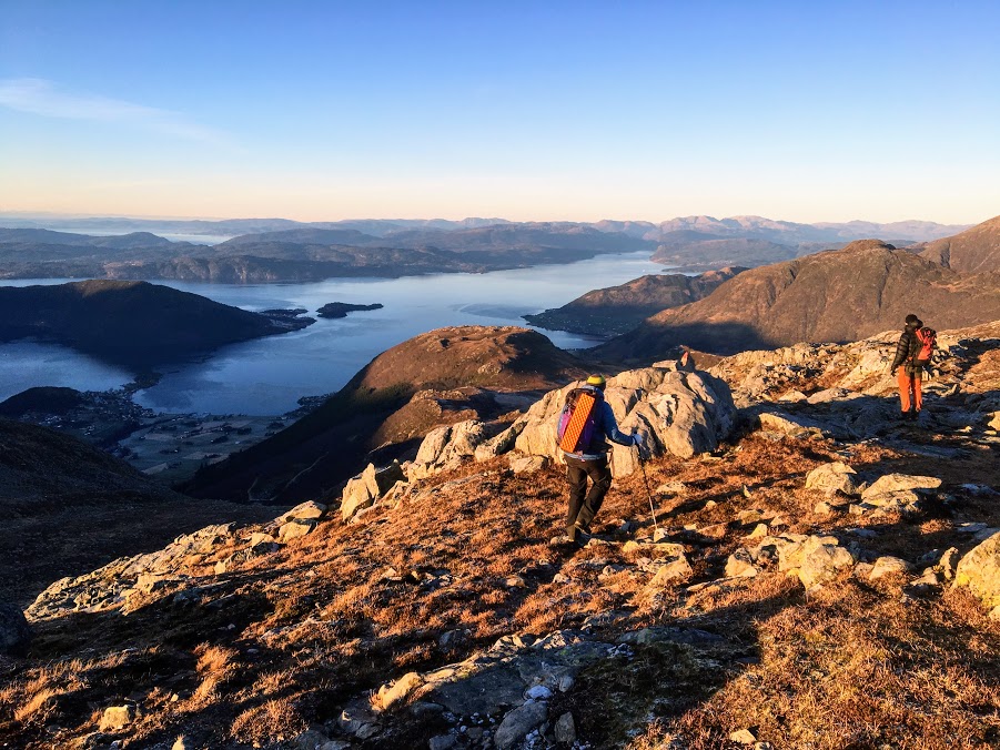 Etter vel ein time på toppen, pakka vi sekkane igjen og byrja på returen. Då nærma klokka seg 1500, og då er det faktisk ikkje så lenge før skumringa byrjar.