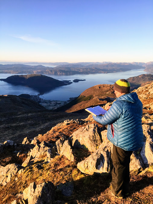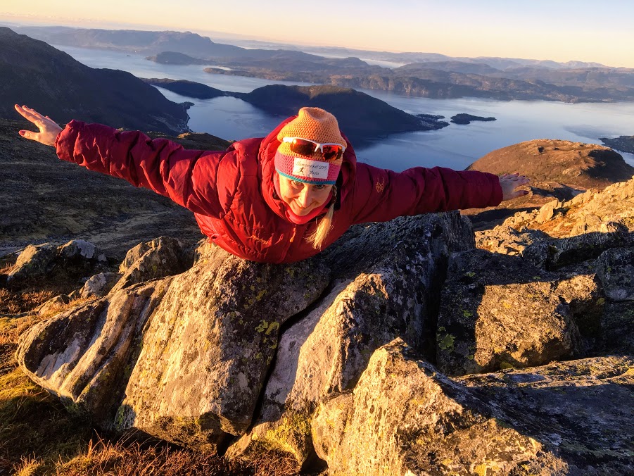 ….religiøs av kor flott det er her oppe 😉 198 navn las ho opp!! Neida, det tok vi oss ikkje tid til, men i fylgje Jorunn var eg person nr. 198 på Kvanto i 2018. Det synes eg faktisk er altfor lite på eit slikt flott fjell, så folkens – kom dåke opp på Kvanto i 2019!