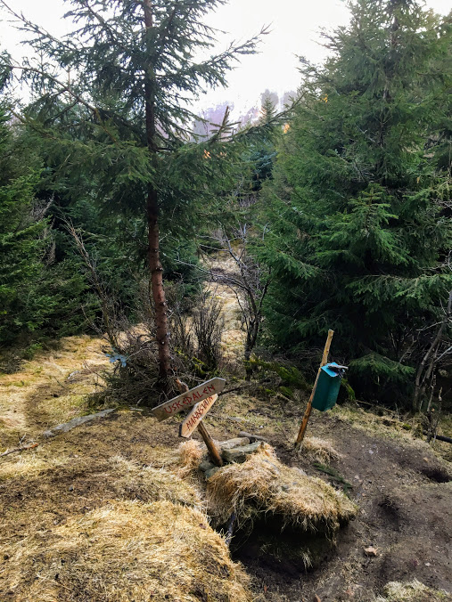 Med tanke på kor mykje det hadde regna dagen før, hadde eg rekna med at det skulle vera vått oppover. Men det var faktisk meir glatt enn vått. Eg hadde ikkje kome langt før eg innsåg at eg anten måtte snu, eller gå heilt til toppen og ned ein anna skogsveg. Utan stavar trur eg det ville vorte ein veeeeeldig lang veg ned på glatt sti…