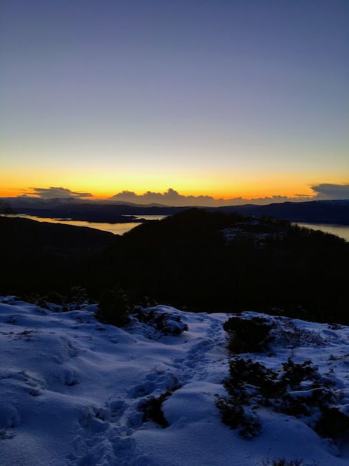 Og akkurat her var mobilen tom for batteri. Det var heilt greit, for no seig myrket på likevel. Eg håpa berre på at eg ikkje skulle snubla å bli liggjande her oppe…»Ho fraus i hel med ørten bileter av ein flott solnedgang på netthinna! Hvis ho hadde tatt litt mindre bileter hadde ho kanskje hatt strøm nok til å ringa etter hjelp…»